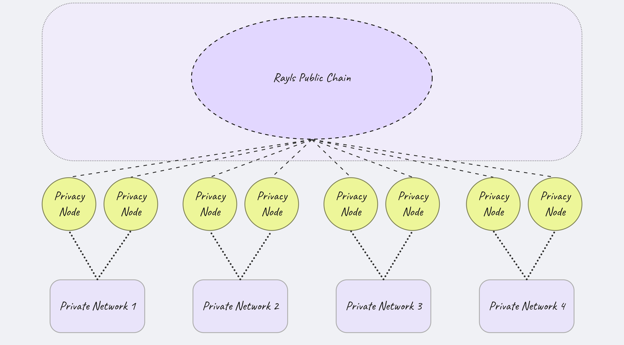 • شبكات Rayls الخاصة – شبكات مصرح بها تربط بين عدة عقد خصوصية (Privacy Nodes) بموجب قواعد مشتركة، مثل الولاية القضائية ونوع الأصول، لتسوية المعاملات بين البنوك وسير العمل القائم على