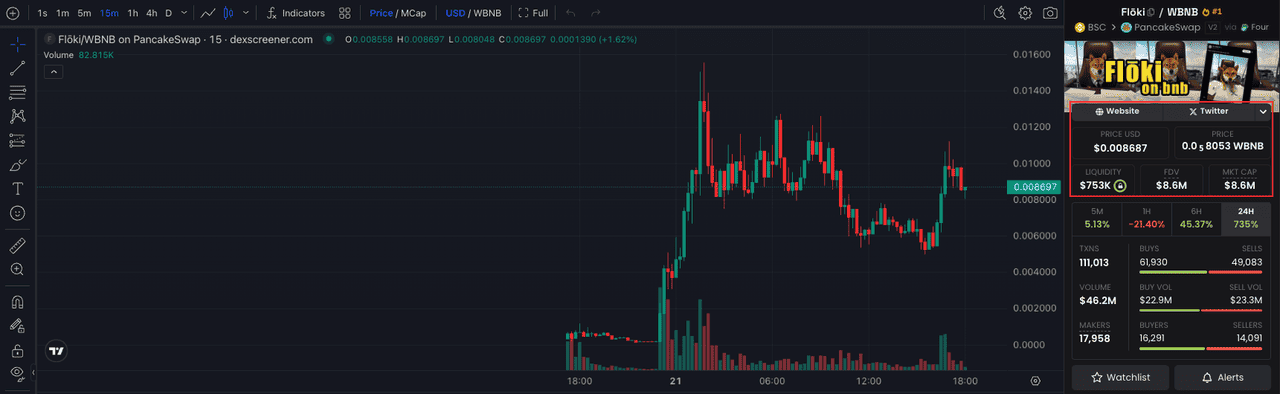 • Interaktive Charts: Jede Paar-Seite enthält einen vollständigen TradingView-Chart sowie wichtige Fundamentaldaten auf der rechten Seite: Liquidität, Marktkapitalisierung und FDV, aktuelle Trades, Top-Halter und Links zu offiziellen Ressourcen. Indikatoren, Zeichnungen und mehrere Zeitrahmen sind alle verfügbar.