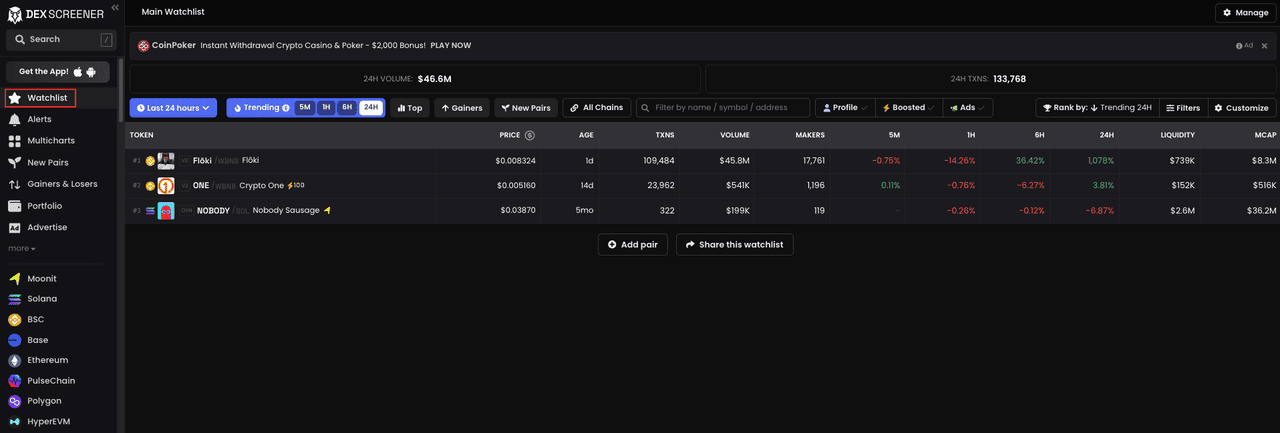 Da es sich auf On-Chain-Paare konzentriert, ist es ideal für Long-Tail-Altcoins und neue Token, die noch nicht auf zentralisierten Börsen gelistet sind. Erstellen Sie Watchlists, setzen Sie Alarme und leiten Sie sogar Trades weiter, indem Sie eine Self-Custody-Wallet verbinden, was Ihnen einen konsistenten Arbeitsbereich für Entdeckung, Analyse und Ausführung über Netzwerke hinweg bietet.