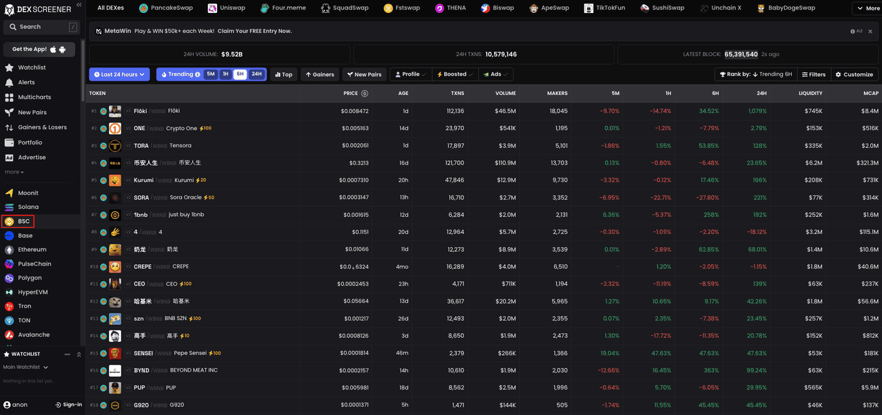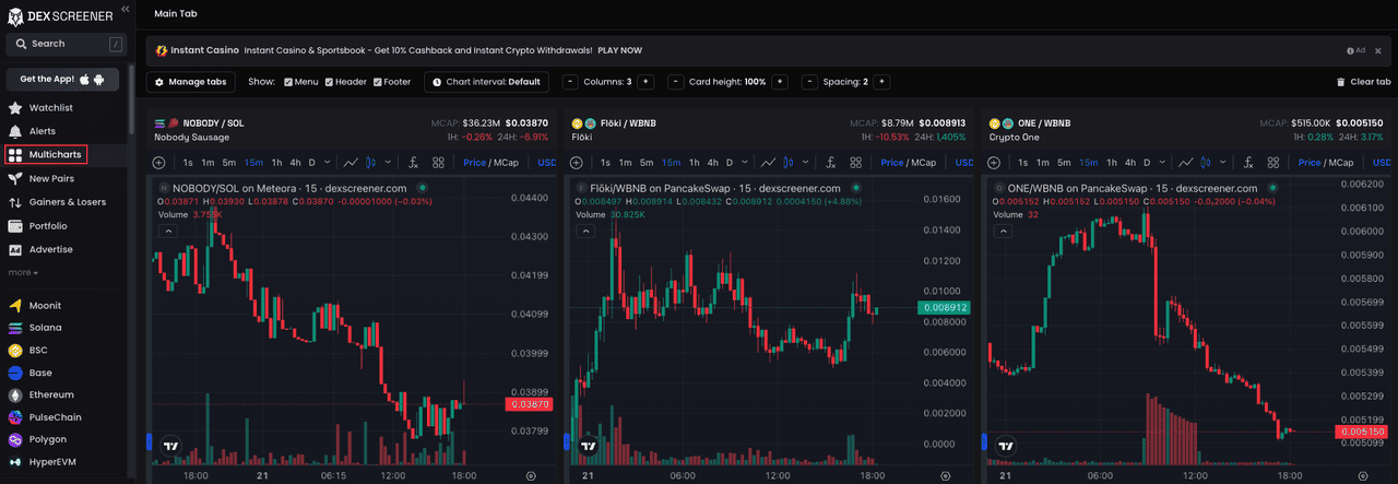 • Trends: Eine spezielle Trends-Seite zeigt Paare an, die sich gerade bewegen. Filtern Sie nach Trendtyp (Preisänderung, Volumenanstieg, neue Listings), wählen Sie einen Zeitrahmen (von 5 Minuten bis 24 Stunden) und beschränken Sie Ihre Suche auf eine bestimmte Blockchain. Es ist eine schnelle Möglichkeit, die Marktaktivität zu scannen.
