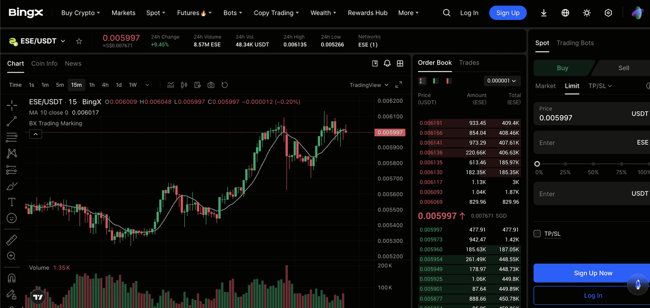 - Auf den Spot-Markt zugreifen: Loggen Sie sich in Ihr BingX-Konto ein, navigieren Sie zum Markt- oder Spot-Tab und suchen Sie nach dem ESE/USDT-Handelspaar.