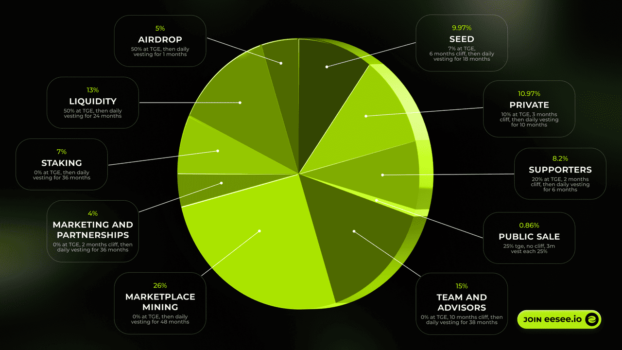 - Unternehmens-Treasury (18%): Verwaltet von der Stiftung zur Finanzierung operativer Ausgaben, strategischer Partnerschaften und zukünftiger Entwicklung des Eesee-Protokolls.