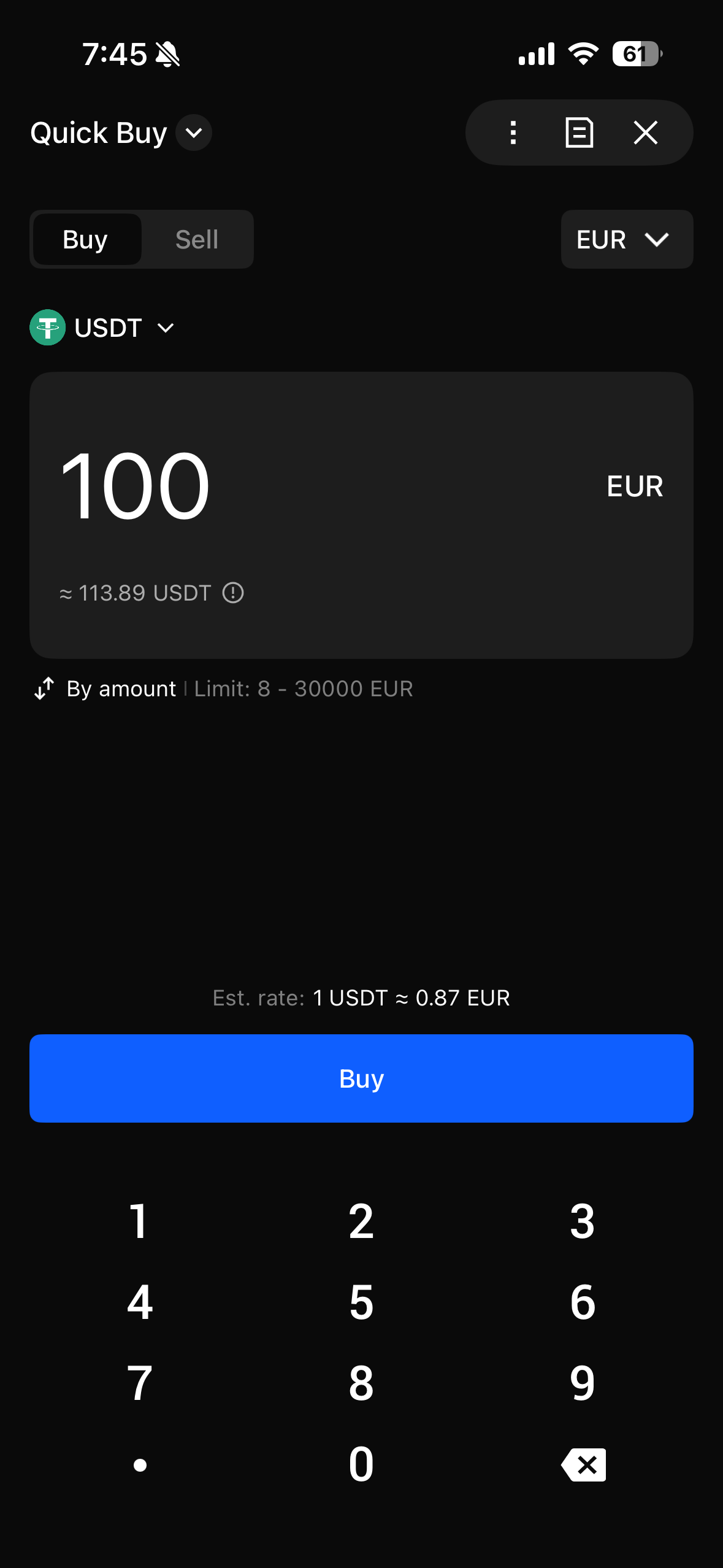 USDT, BTC, ETH) and enter the amount in USD or EUR.