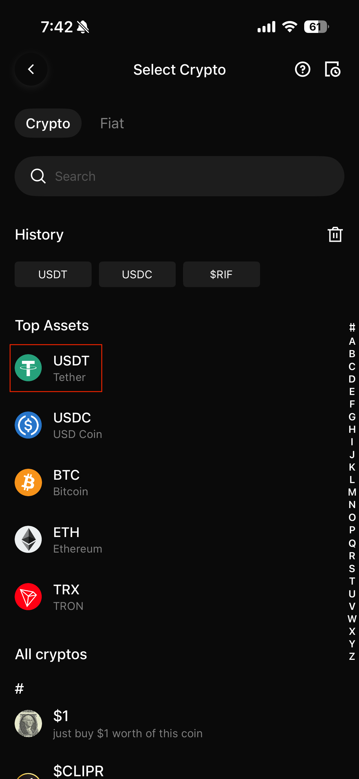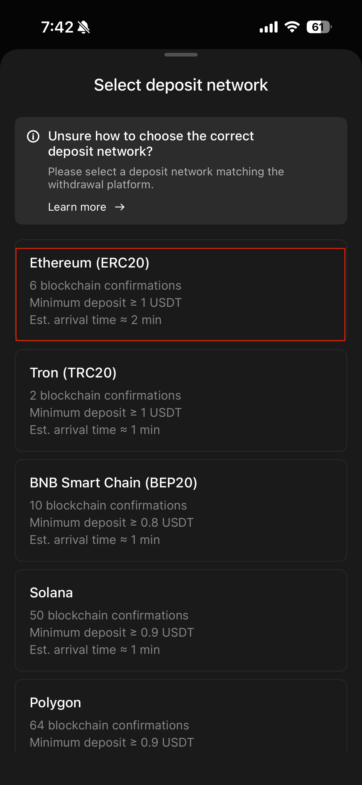 • Choose the correct network (TRC20 / ERC20 / BEP20, etc.).