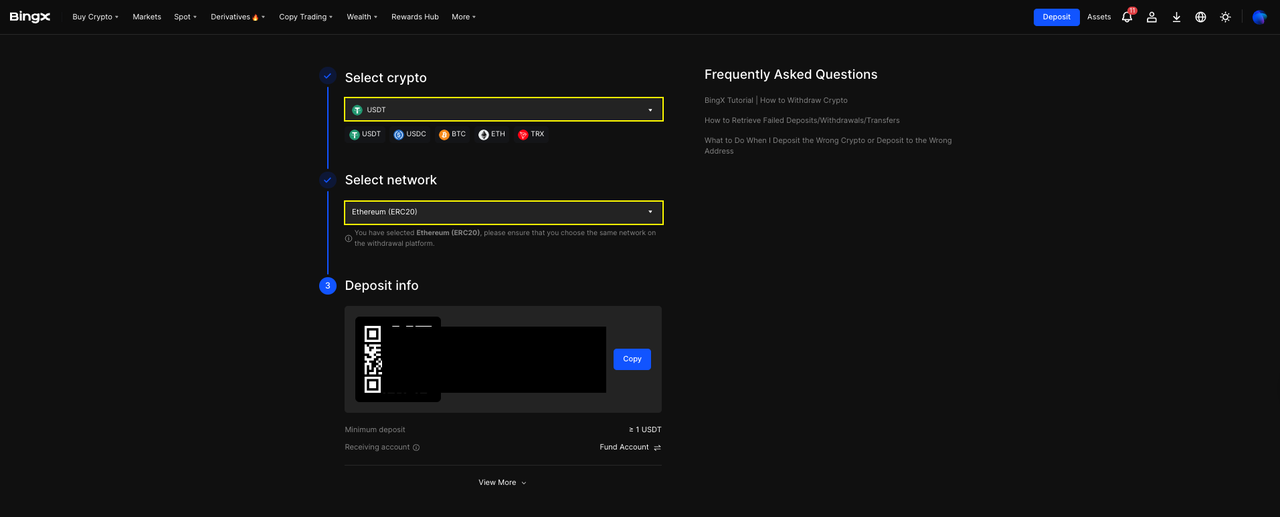 USDC are popular for quick funding, then you can swap into BTC or ETH on Spot. Just ensure the network matches what BingX supports for deposits.