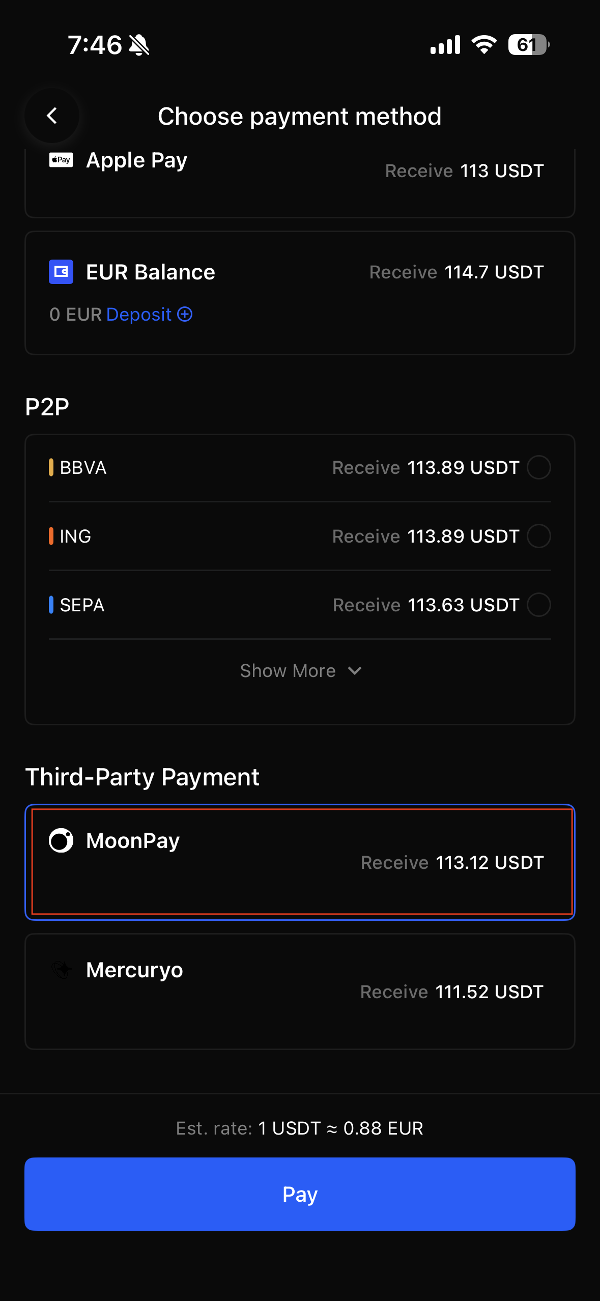 4. Select MoonPay as the third-party payment method and click 'Pay'.