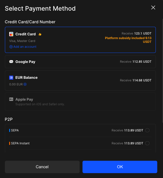 3. Select the fiat currency and payment method: Choose your fiat currency, e.g. EUR or USD. In most regions, the card route first buys USDT. Enter the amount you want to spend and select Credit Card as the payment method.
