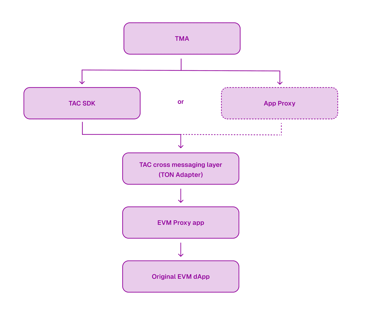 TAC’s architecture is built like a three-layered system that works together to make Ethereum apps feel native inside Telegram: