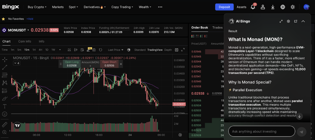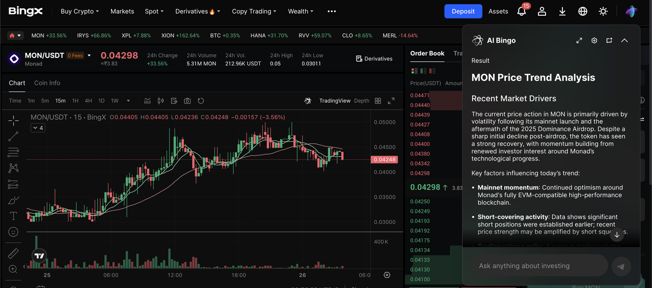 You can trade Monad (MON) on BingX through both Spot and Futures markets, with real-time insights and strategy recommendations powered by BingX AI for smarter, faster decision-making.