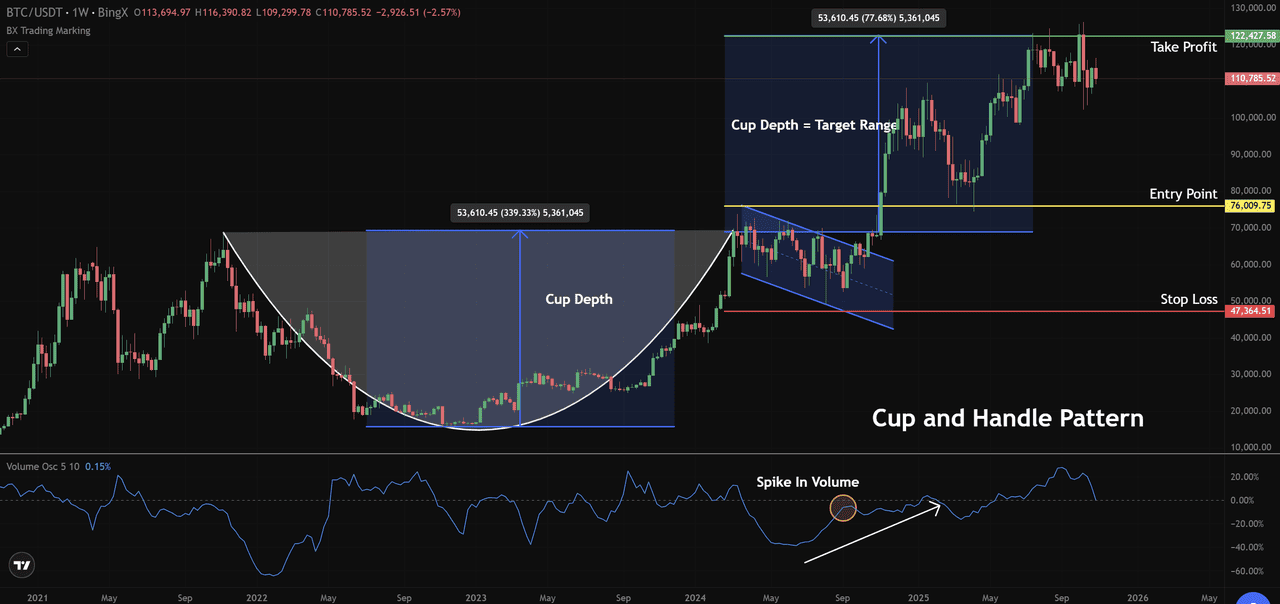On BingX, the BTC/USDT weekly chart showed a breakout above $76,000, with a cup depth of $53,000, projecting a target near $122,000, a move confirmed by a clear volume spike.