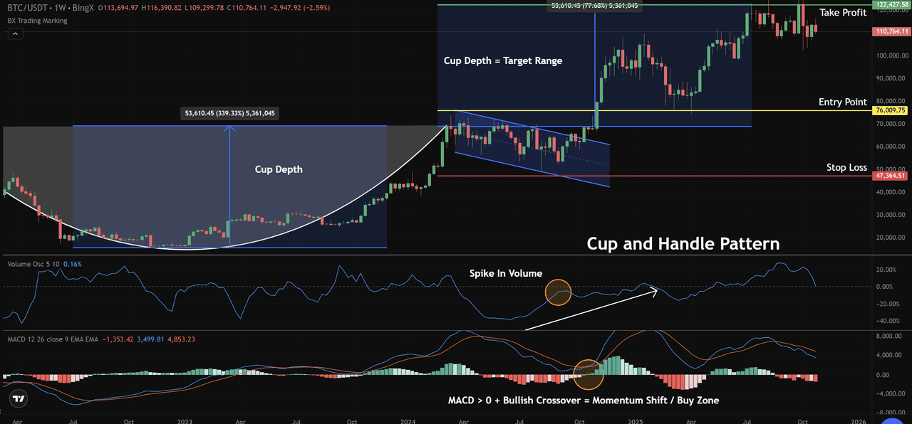 • Take-Profit: Use the cup depth to project your target range from the breakout level. With a cup depth of roughly $53,000, the take-profit zone sits around $122,000, aligning with Bitcoin’s next resistance area.