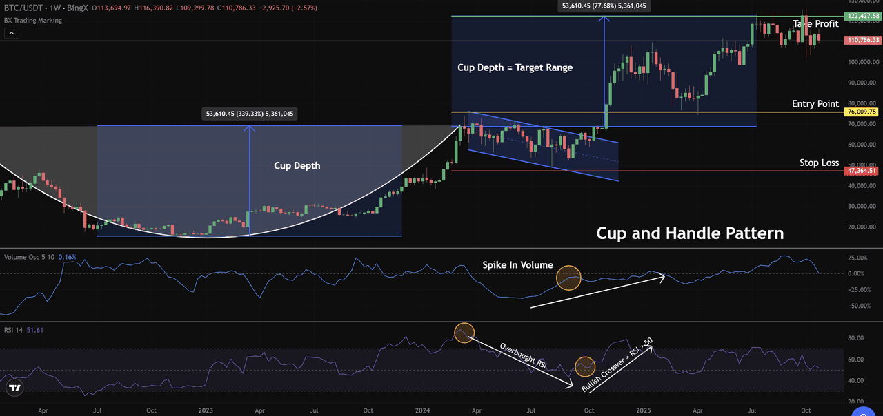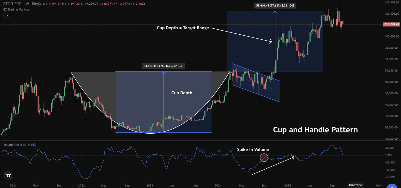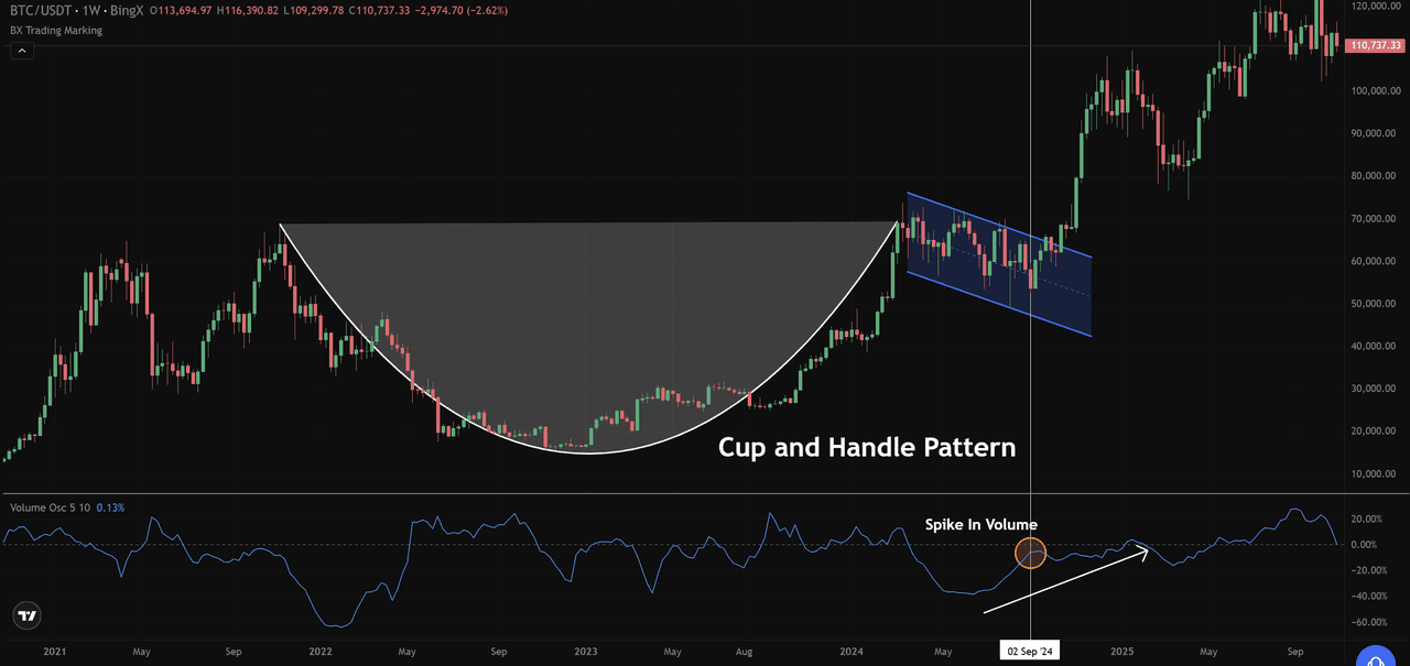 In Bitcoin’s case, the BTC/USDT weekly chart shows a decline from around $69,000 (2021) to a low near $15,500 (2022), creating the cup base. The rim near $70,000–$72,000 and a descending handle formed next, before a volume spike in September 2024 confirmed the breakout above $72,000, leading to a rally toward $100,000.