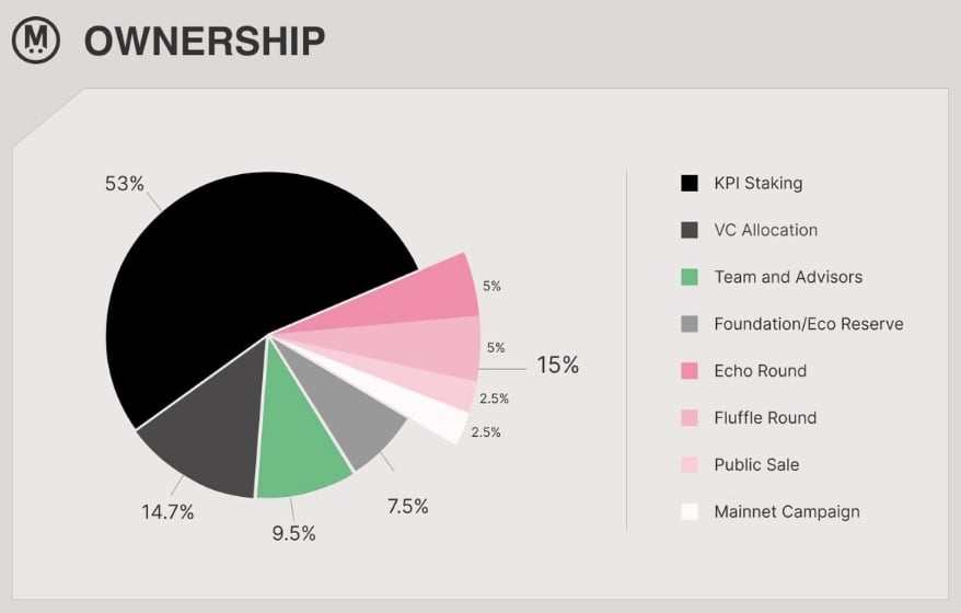 The Fluffle NFT collection represents around 5% of total supply, rewarding early community members and Mega Mafia teams. The KPI staking model ties emissions to measurable on-chain growth, decentralization, and uptime metrics, ensuring $MEGA distribution reflects real network progress rather than fixed schedules.