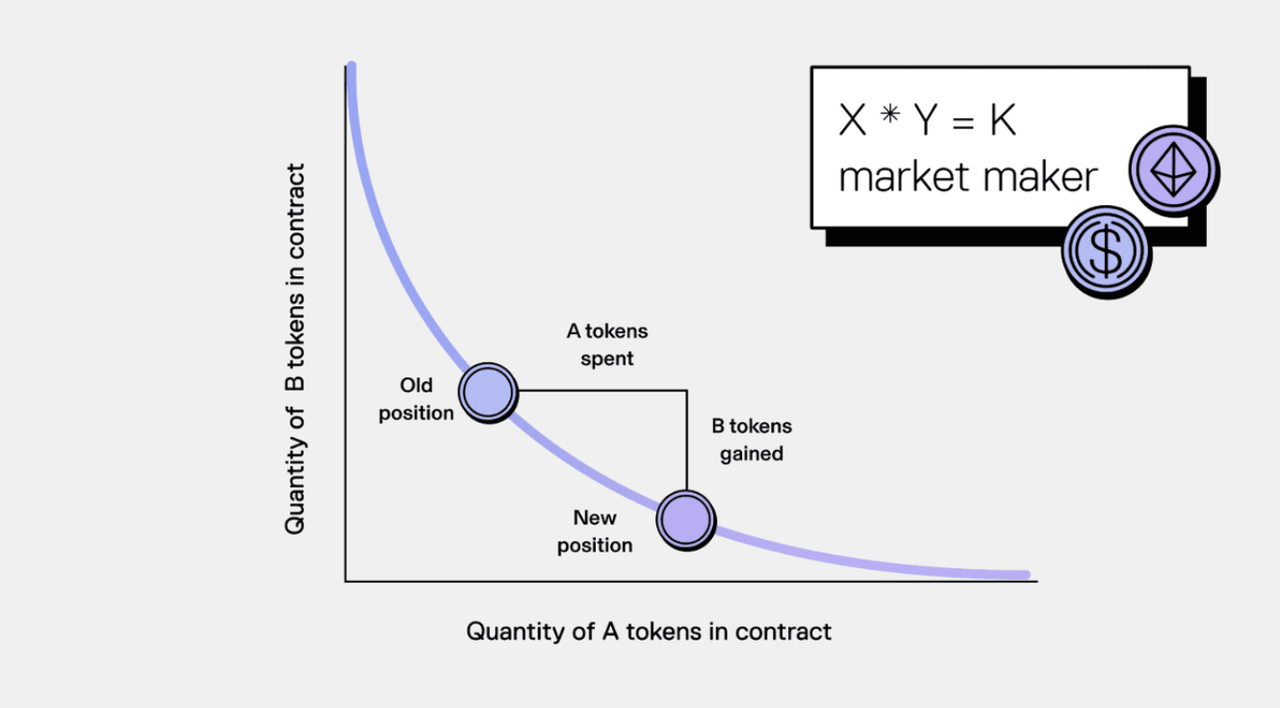 Automated Market Makers (AMM): The AMM uses the constant-product formula "x · y = k" to determine token prices. As trades occur, the ratio between the two tokens changes, and the AMM adjusts the price automatically to maintain the constant product. This approach removes the need for order books and ensures that trades can be executed at any time.