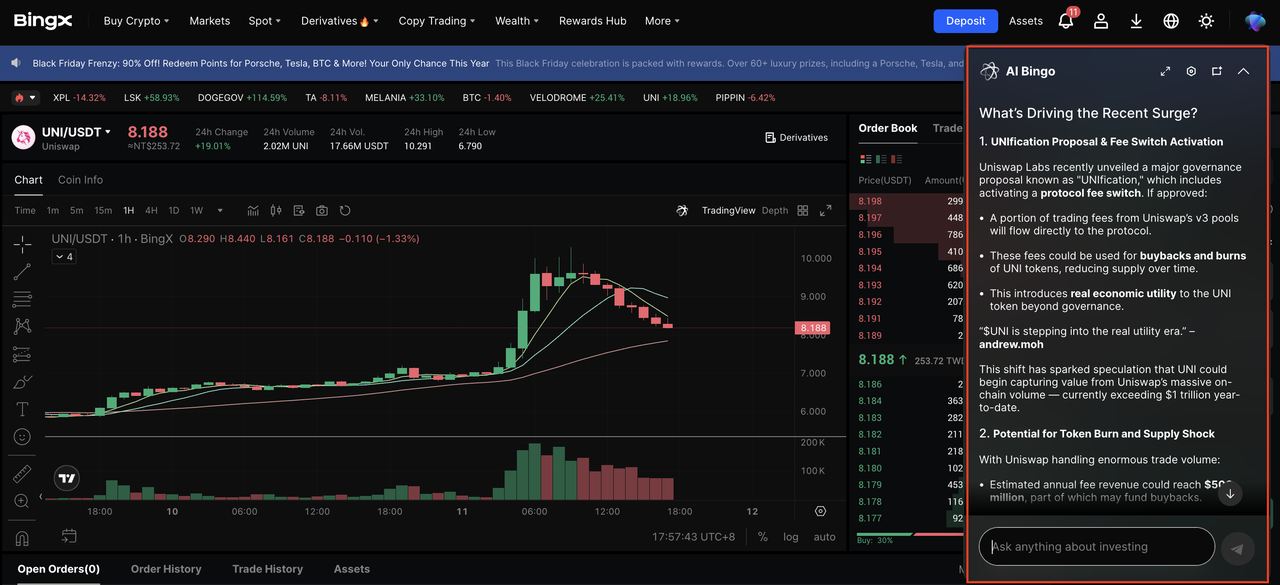 BingX supports UNI on both Spot and Futures markets, making it easy to build long-term positions or trade short-term price movements. BingX AI is integrated directly into the chart to help identify support and resistance, breakout zones, and potential entry ranges.
