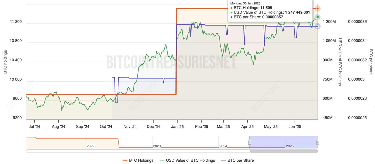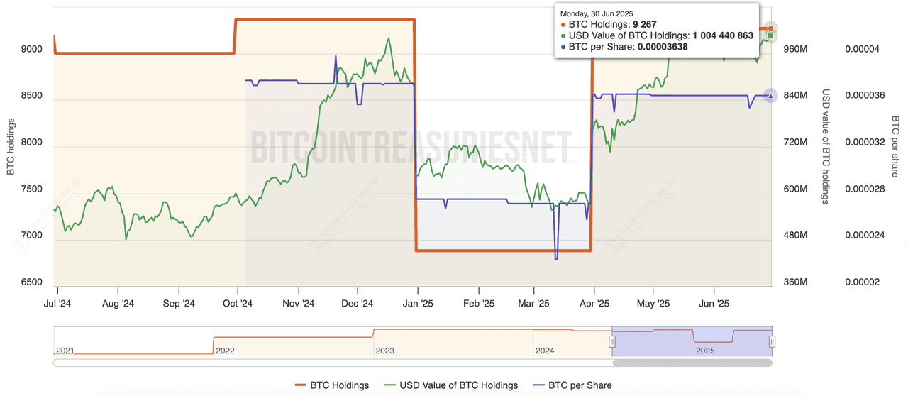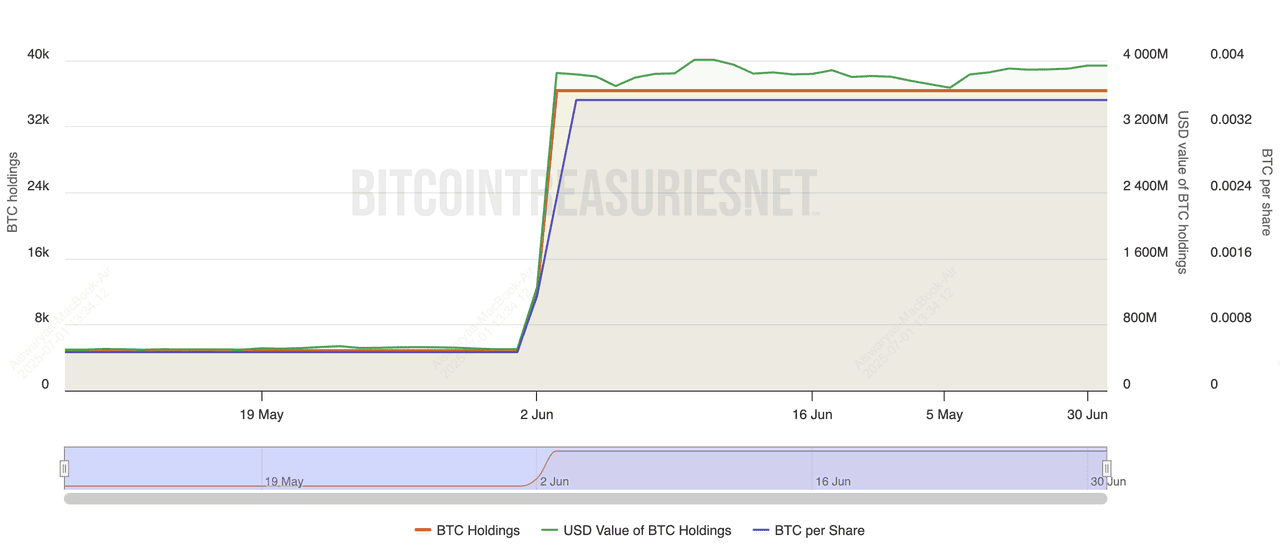 XXI, trading under the ticker CEP, is a lesser-known U.S.-based public company that has quickly risen through the Bitcoin treasury ranks. In just over a year, it accumulated 37,230 BTC, largely through strategic debt offerings and aggressive purchases in Q4 2024 and early 2025. While the company’s core business remains in enterprise services, its pivot toward a BTC-heavy treasury has boosted its valuation, even though some analysts have flagged liquidity concerns due to its relatively smaller market cap compared to holdings.