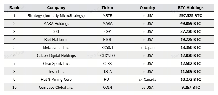 Strategy (formerly MicroStrategy) holds the most, with nearly 600,000 BTC. Other major holders include MARA Holdings, XXI, Riot Platforms, and Metaplanet.