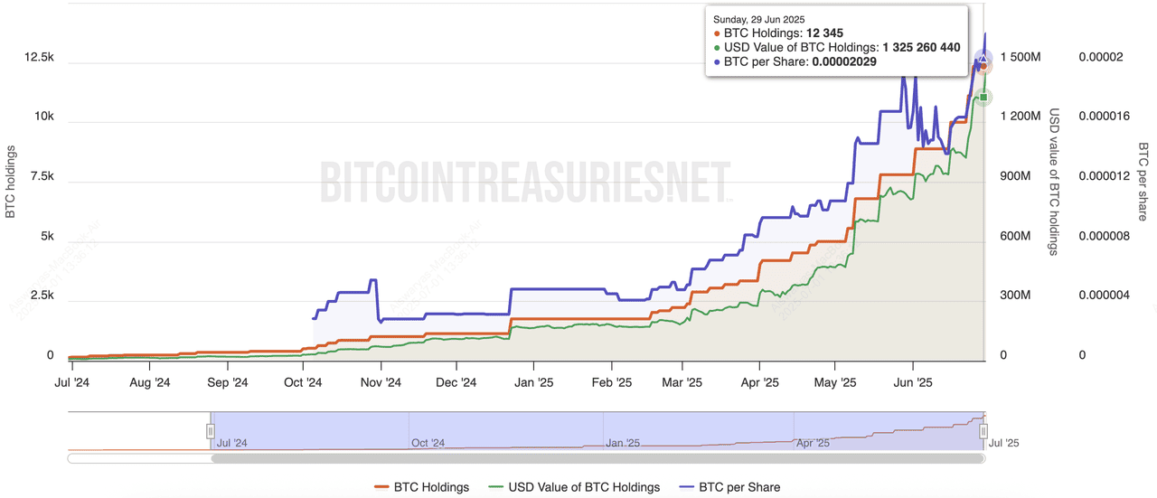 Metaplanet is a Tokyo-listed company often called the "Asian Strategy" due to its Bitcoin-focused pivot. It began accumulating Bitcoin in 2024 and now holds 13,350 BTC as of mid-2025. Originally a hospitality firm, Metaplanet has since rebranded to focus on digital assets, even launching Japan’s first Bitcoin-themed hotel. Its treasury growth has been financed through stock sales and direct BTC purchases, and the company aims to grow its holdings to 10,000 BTC more by year-end.