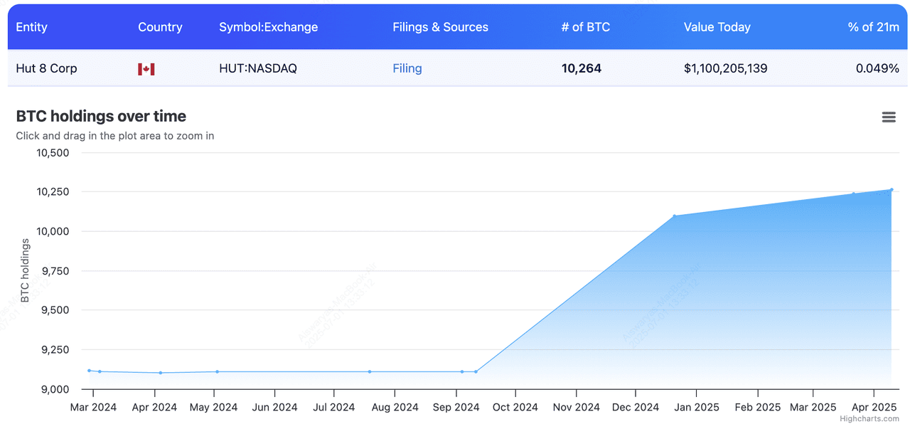 Hut 8 is a Canadian Bitcoin mining company with operations in Alberta and Texas. The firm merged with U.S. Bitcoin Corp in 2023, expanding its capacity significantly. As of 2025, Hut 8 holds 10,273 BTC, much of it self-mined. The company also generates yield by lending out a portion of its BTC through prime brokerage partners. Hut 8 continues to expand its infrastructure to support both mining and AI-related compute operations.