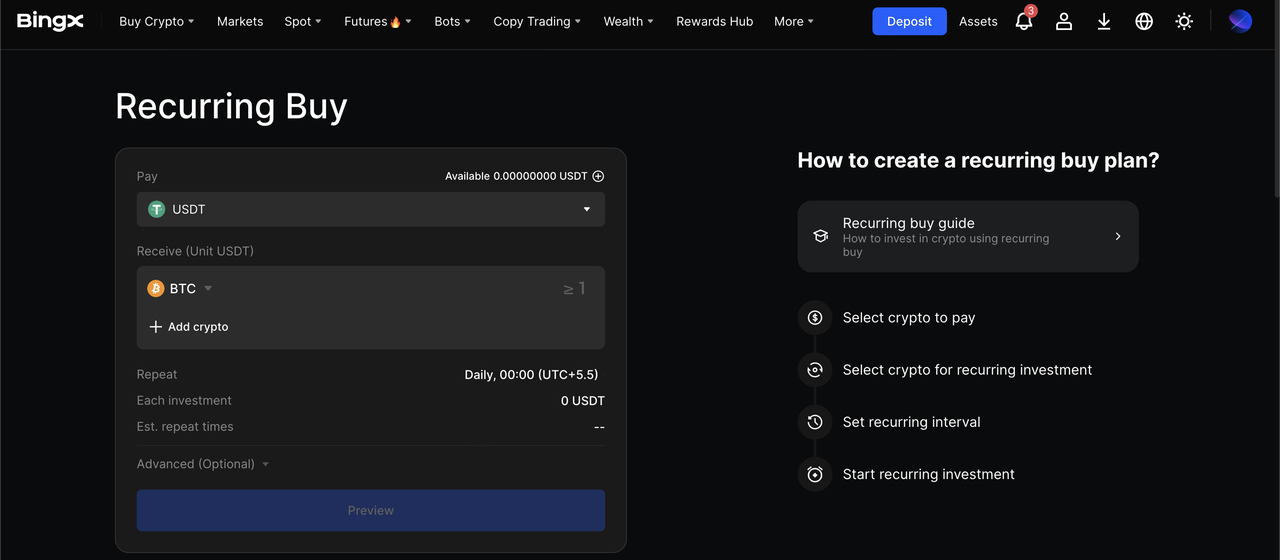 2. Select BTC and choose your investment amount and frequency like daily/weekly.