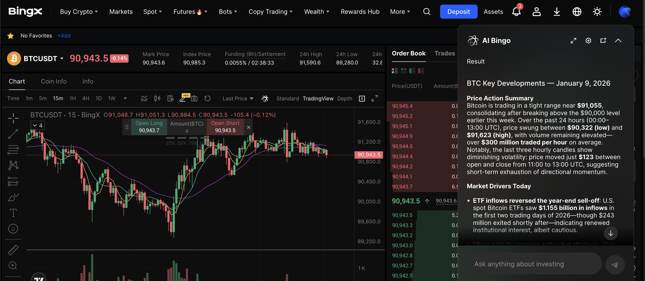 While spot Bitcoin ETFs offer regulated exposure through traditional brokers, trading Bitcoin (BTC) directly on BingX provides greater flexibility, deeper market access, and more active control over your strategy. Unlike ETFs, limited to market hours, fixed fees, and passive price tracking, BingX lets you trade BTC 24/7, access real-time global liquidity, and use advanced tools such as BingX AI insights to analyze trends, manage risk, and identify opportunities across spot and derivatives markets.