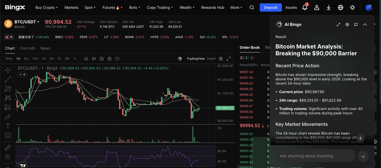 BTC/USDT trading pair on the spot market powered by BingX AI insights