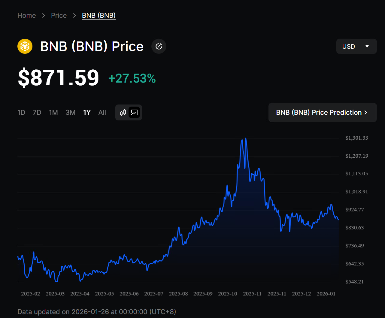 At the time of writing (January 26, 2026), BNB is trading at approximately $871.59 per token, implying a theoretical valuation in excess of $80 billion for these holdings at current market prices. By comparison, when