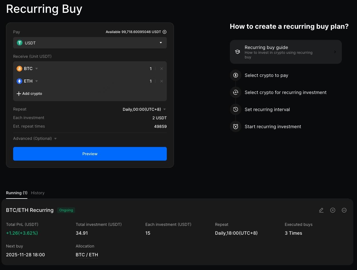 3. Use only idle or disposable money: Set an investment amount that won’t affect your daily expenses or emergency savings. Keeping Recurring Buy within a safe portion of your income ensures you can continue investing sustainably through both bull and bear markets.