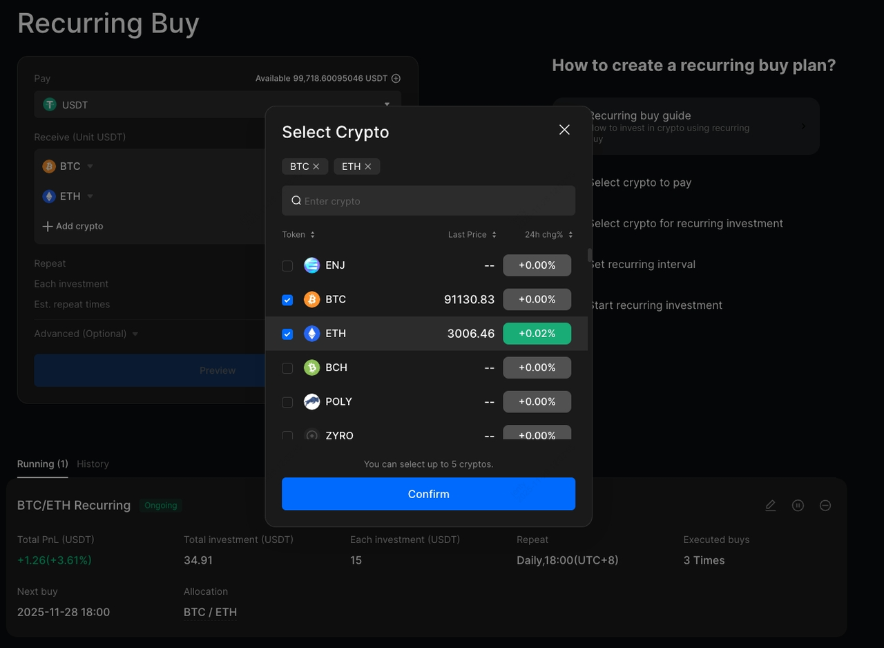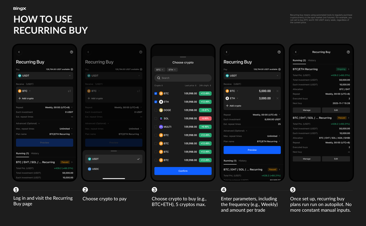You can set up Recurring Buy for BTC, ETH, and most spot-listed cryptocurrencies on BingX, choosing up to five tokens per plan to diversify your automated purchases.