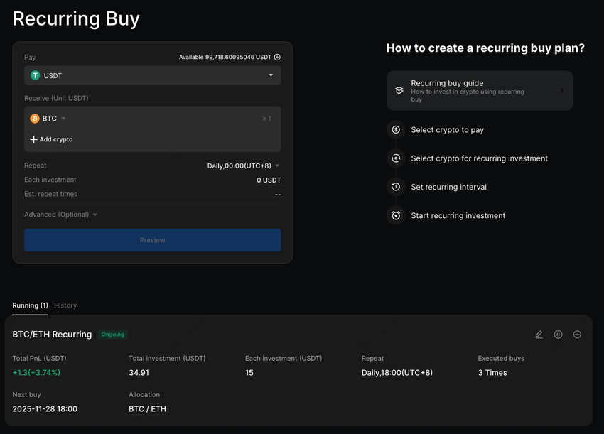 4. Anyone who wants to build a consistent investment habit: Recurring Buy works like a “crypto savings plan.” Small, regular purchases help you stay disciplined, avoid emotional decisions, and turn crypto investing into a simple routine. It’s perfect for people who want stability, structure, and long-term planning.