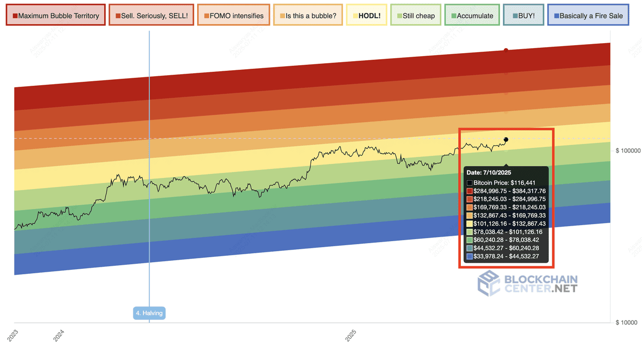 Locate Bitcoin’s current price within the colored bands. As of July 2025, BTC sits in the yellow "HODL!" zone, suggesting a fairly valued market.