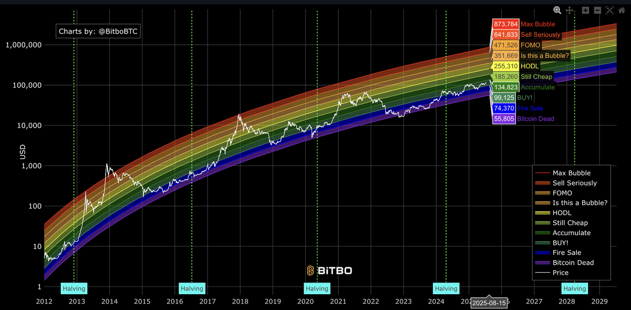 The current Bitcoin Rainbow Chart (V2) is available on BlockchainCenter and TradingView, and it’s widely used by traders to understand whether Bitcoin’s price aligns with historical trends or is deviating into extreme zones.