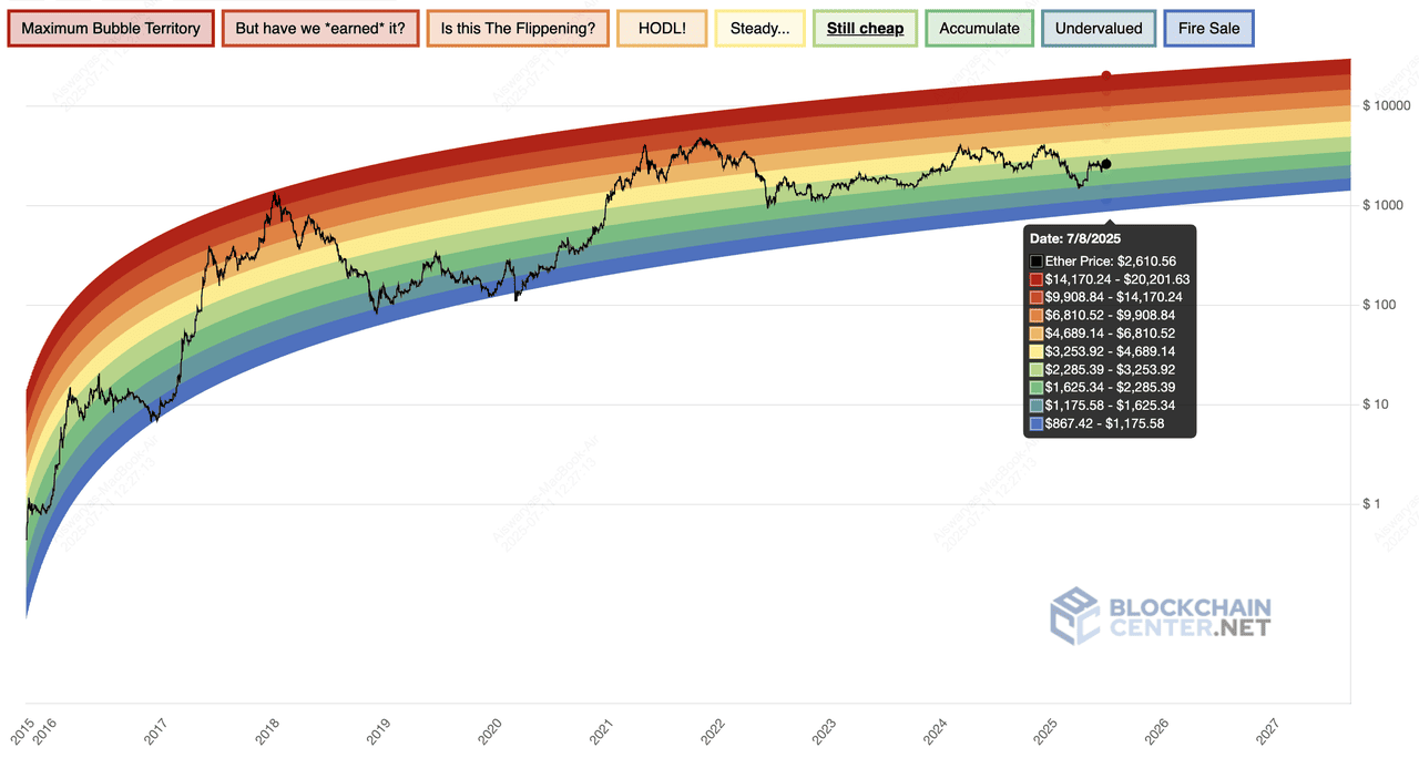 1. Ethereum Rainbow Chart: Apply the same concept to Ethereum’s price history. For example, if both BTC and ETH sit in their “Still Cheap” bands, it may suggest a broader market accumulation phase.
