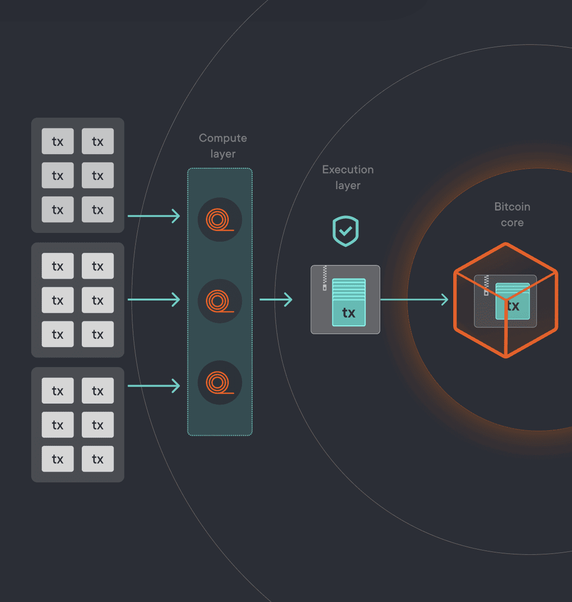 1. Compute Off-Chain: DeFi apps, rollups, and virtual machines run at high throughput in an execution environment off Bitcoin L1.