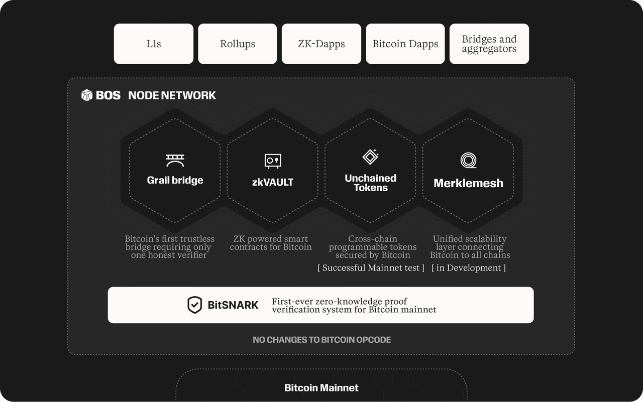 Bitcoin usage is exploding, Ordinals, BRC-20s, and BTC-Fi have pushed transaction fees to multi-year highs and exposed the limits of Bitcoin’s 7 TPS (transactions per second) base layer. BitcoinOS (BOS) answers that pressure with a modular “operating system” that runs heavy computation off-chain, proves correctness with zero-knowledge proofs, and settles on Bitcoin without altering Bitcoin’s consensus. Its architecture revolves around BitSNARK, a ZK-verification VM purpose-built for Bitcoin, and Grail, a practical bridge that moves assets between Bitcoin (L1) and rollups (L2) with a powerful “honest-single” security guarantee.