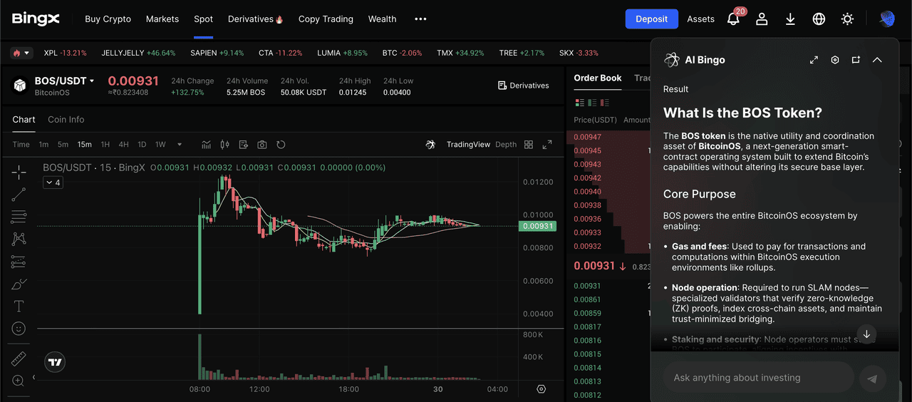 The BOS token has begun appearing on centralized exchanges, including a BOS/USDT spot listing on BingX, giving traders direct access to the network’s native asset.