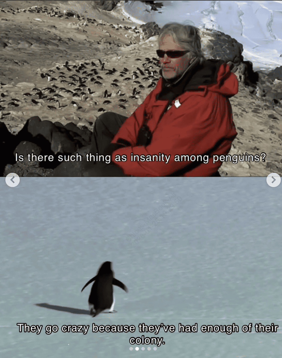 The "Nihilist Penguin" meme, originating from a poignant scene in Werner Herzog's 2007 documentary