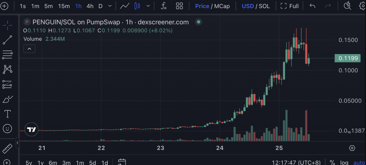 The PENGUIN token serves as the native cryptocurrency of the Nietzschean Penguin project, operating on Solana with a total and circulating supply of 1B tokens. It functions as a speculative asset without inherent utility, relying on market sentiment, community hype, and external events for value appreciation. As of January 25, 2026, PENGUIN trades at $0.0915 (with a 24-hour range of $0.07298-$0.1338), has a market capitalization of $91.4 million, and recorded a 24-hour trading volume of $269.4 million (with peaks reaching up to $402 million across tracked exchanges). The explosive surge occurred on January 24, 2026, following a viral White House X post featuring an AI-generated image of President