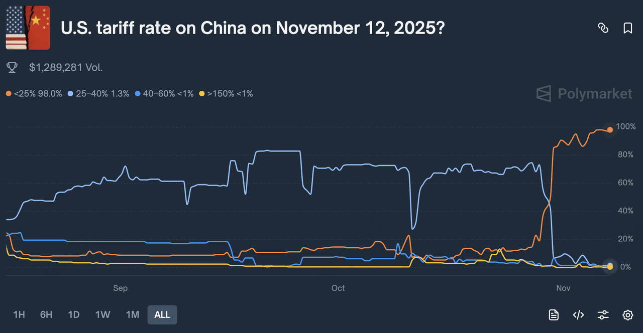 10. China Trade-Deal Spike (October 27, 2025): TRUMP jumped nearly 30%, from $6.20 to above $8, after Trump said a U.S.–China trade deal was coming soon. Daily volume exceeded $1 billion, with centralized exchanges taking the lead. However, Polymarket users anticipate only a 25% likelihood of a US-China trade deal being finalized by mid-November.