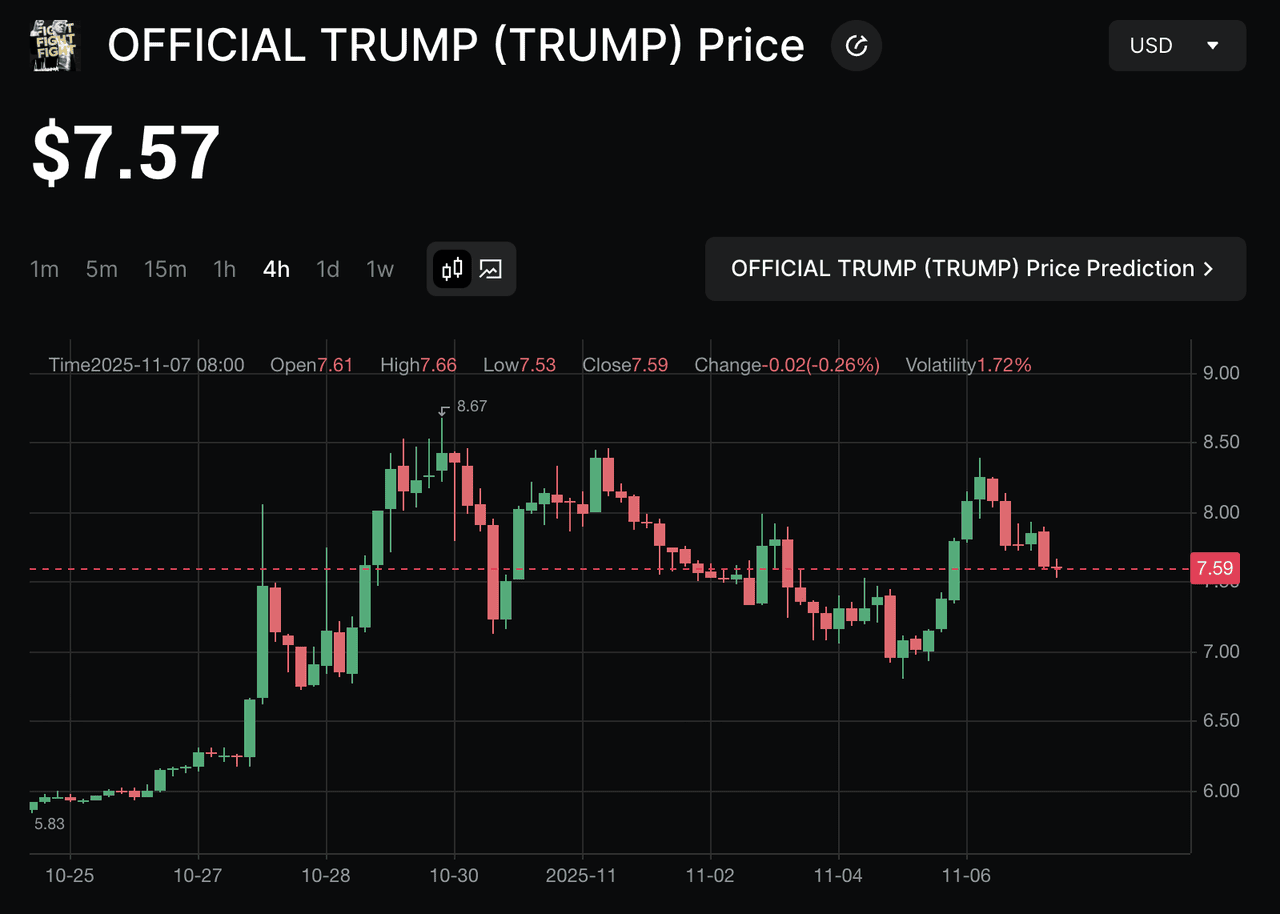 As of November 2025, TRUMP trades under $10, reflecting significant volatility since launch. But it remains highly liquid, widely listed, and strongly tied to political news cycles, particularly speeches, policy announcements, TRUMP coin ETF filings, and major economic headlines that involve President Donald Trump. In a market where memes often move faster than fundamentals, TRUMP has become a real-time barometer of political sentiment within crypto.