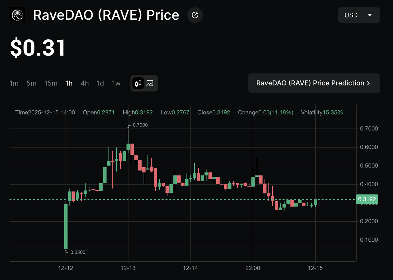 RAVE recorded strong early momentum following its TGE in December 2025, where 23.03% of the supply entered circulation and the token was listed across multiple major exchanges. The price surged to a post-launch all-time high of $0.64 on December 13, 2025 before stabilizing within the $0.26–$0.51 range, supported by a $68 million market cap, over $70 million in 24-hour trading volume, and a circulating supply of 230.3 million tokens. This trading activity reflects healthy initial liquidity and market participation as RaveDAO expands its real-world event ecosystem and on-chain economy.