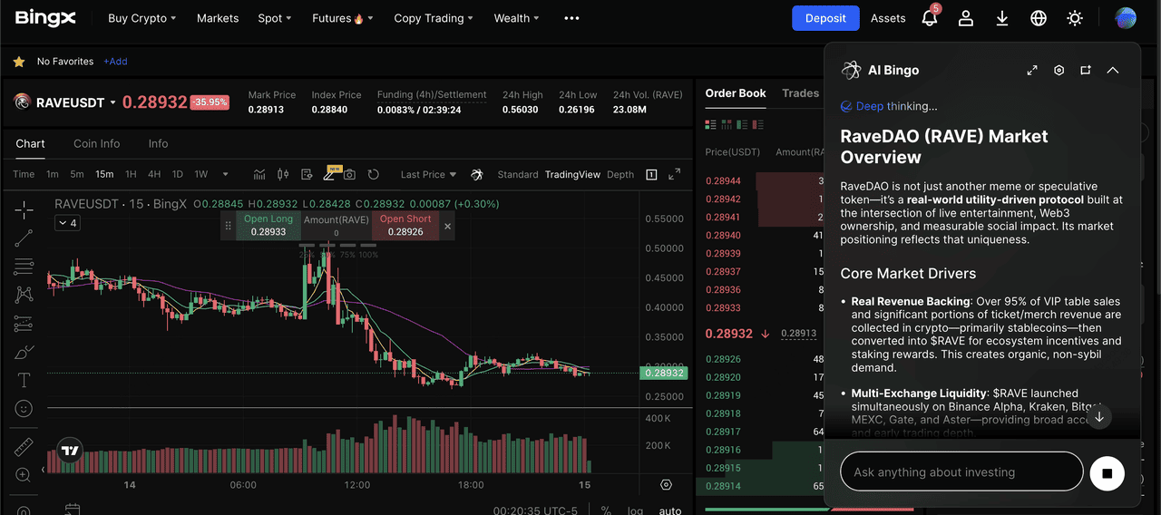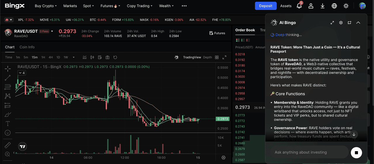 BingX AI provides real-time insights, market signals, and automated analysis to help you trade RAVE more confidently across both Spot and Futures markets.