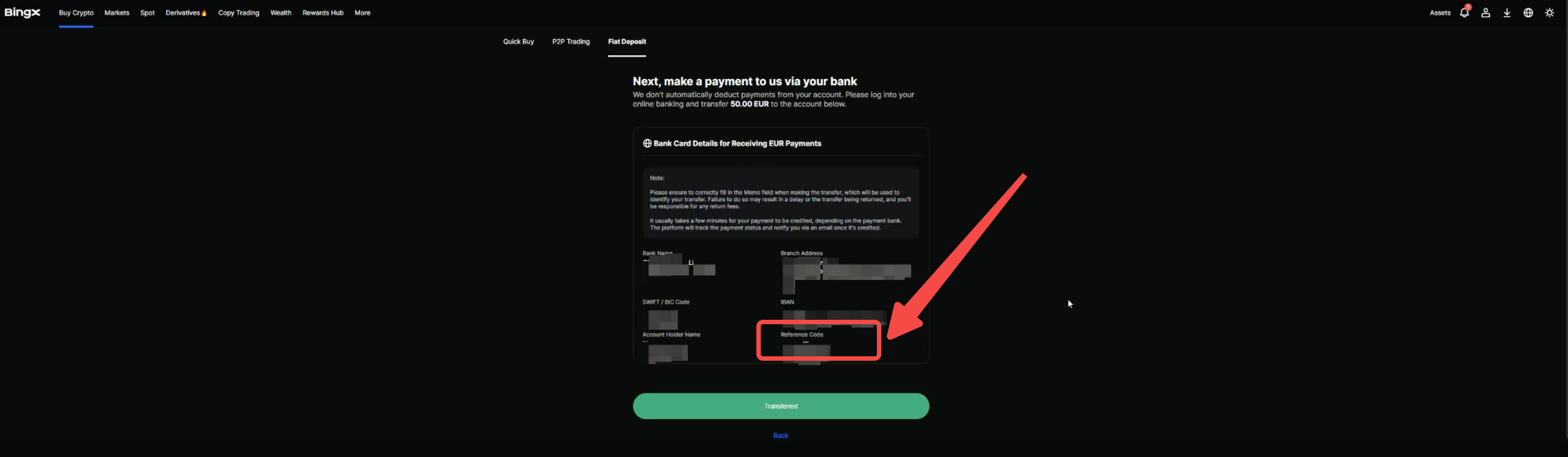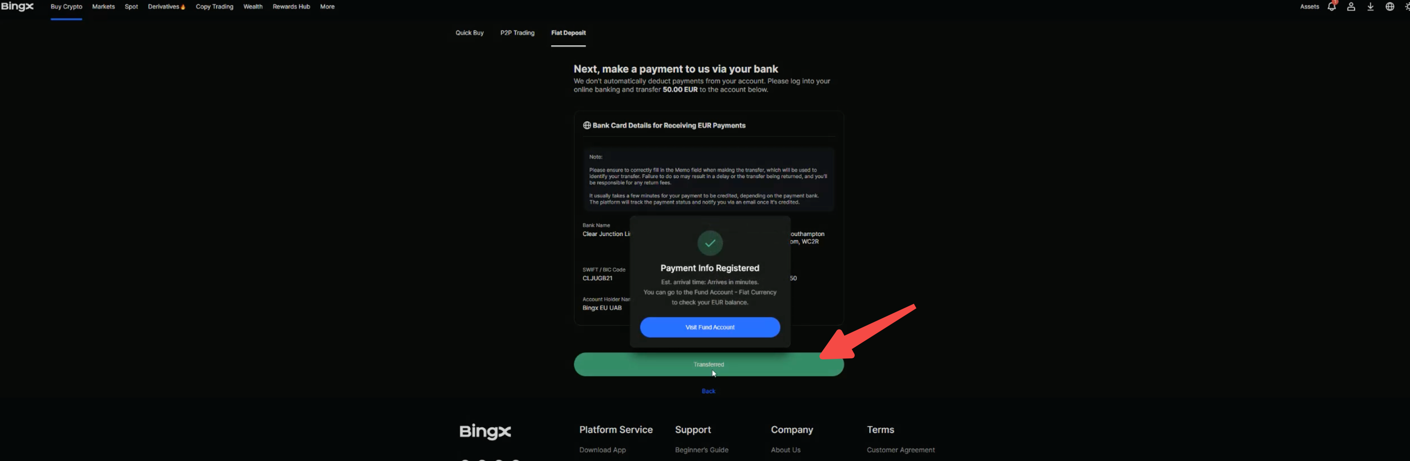 Step 4: After completing the transfer, click “Transferred” and wait for your funds to arrive. Processing times may vary depending on your bank.