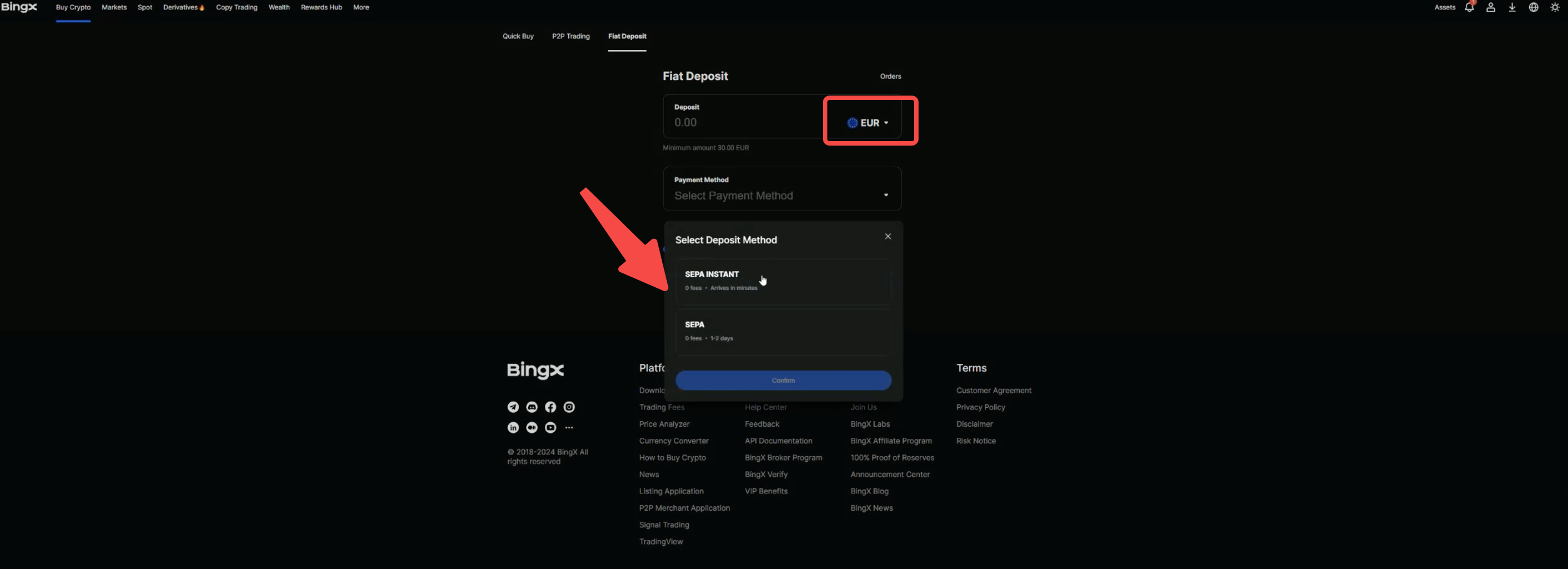 Step 2: Select the fiat currency you would like to deposit, enter an amount, and choose a payment method. Then, click "Continue".