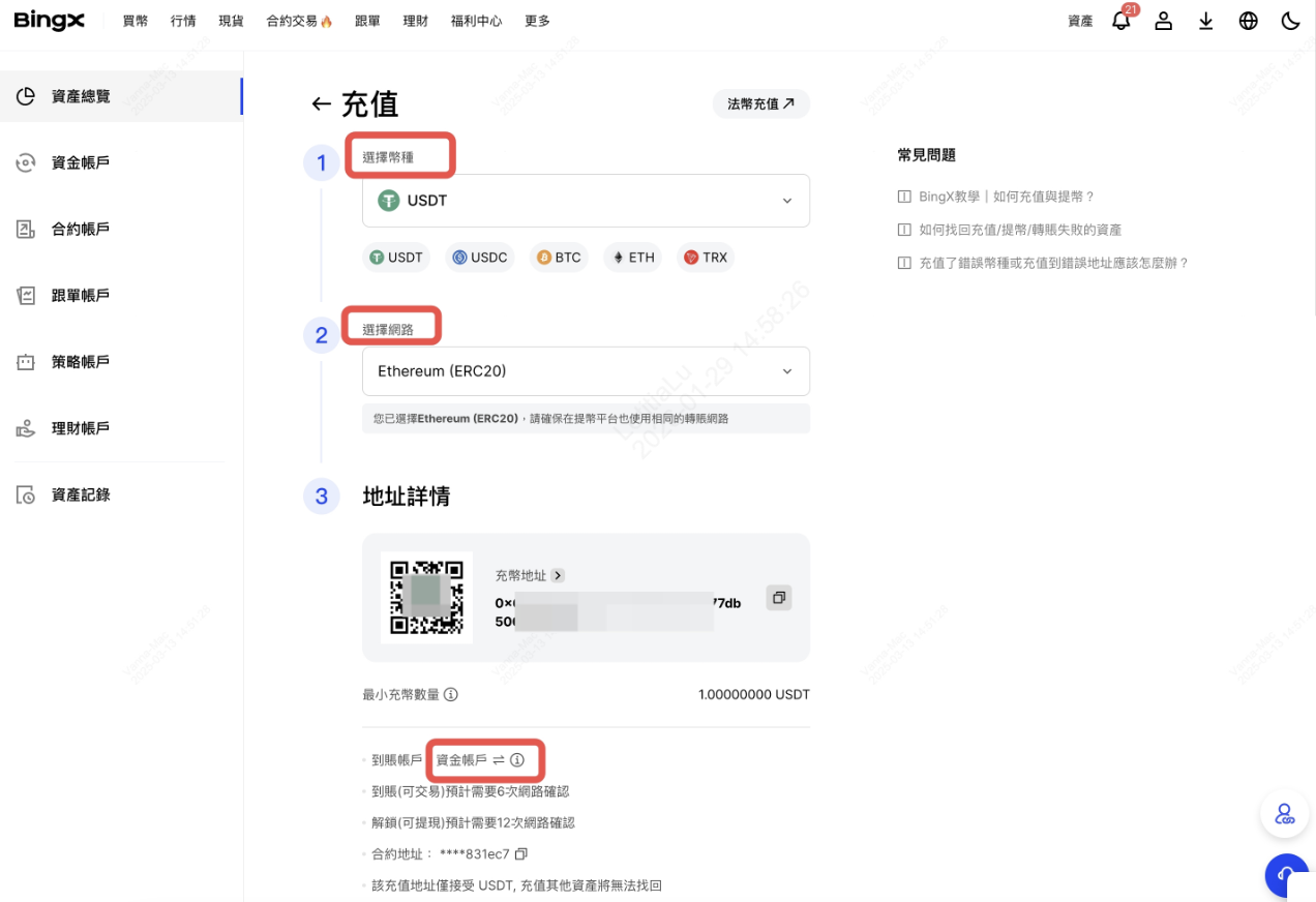 USDT,再將 USDT 轉入 BingX 指定錢包地址。資金到帳後,即可進入 BTC/USDT 現貨市場進行交易。這種方式彈性較高,手續費結構相對單純,整體交易成本通常也較低,適合以交易效率與成本控制為優先考量的投資者。