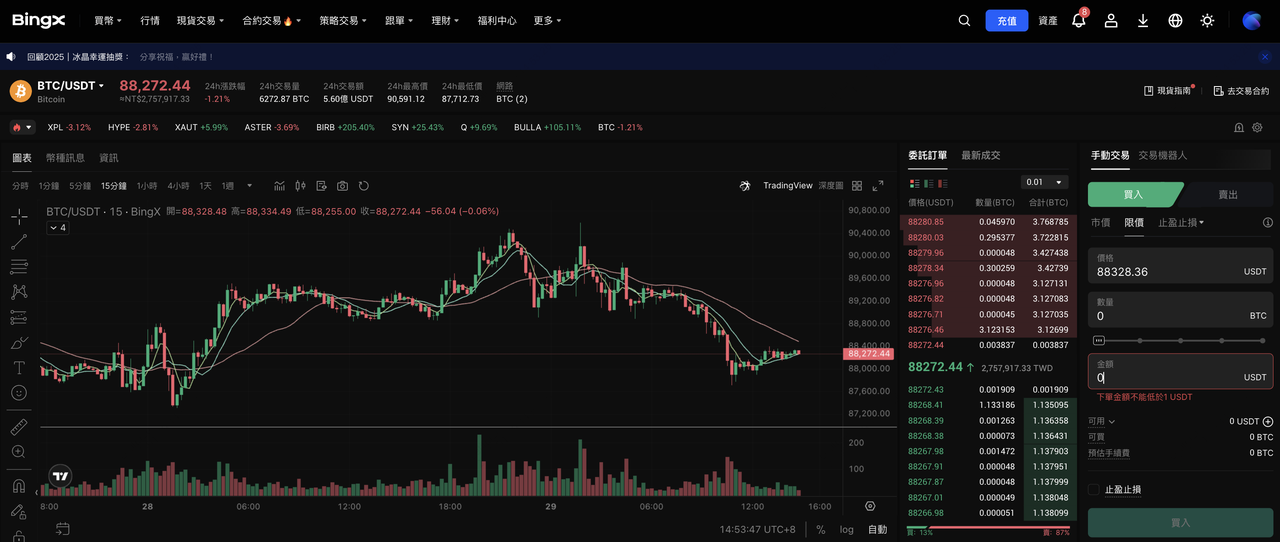 對多數台灣用戶而言,國際型交易所因市場深度與產品完整度較高,成為主要選擇之一。例如 BingX 提供比特幣現貨與相關衍生性商品交易,操作介面相對直覺,也能在同一平台內完成資產管理與交易需求,適合作為主要購買管道。