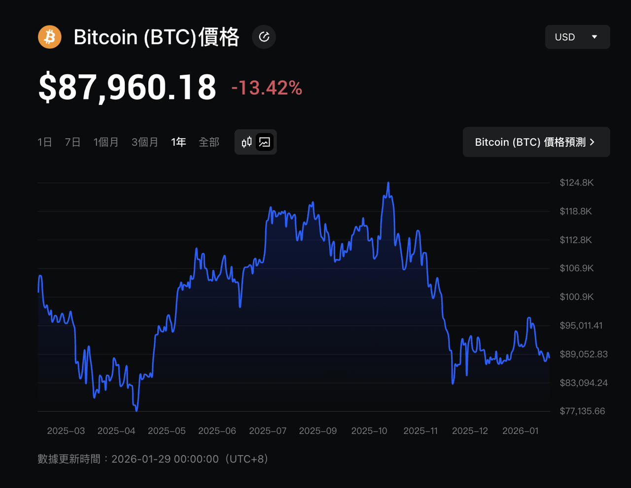 比特幣價格約落在 89,000 美元附近,相較於 2025 年 10 月創下的約 126,000 美元歷史高點,市場已進入高位整理階段。即使期間伴隨