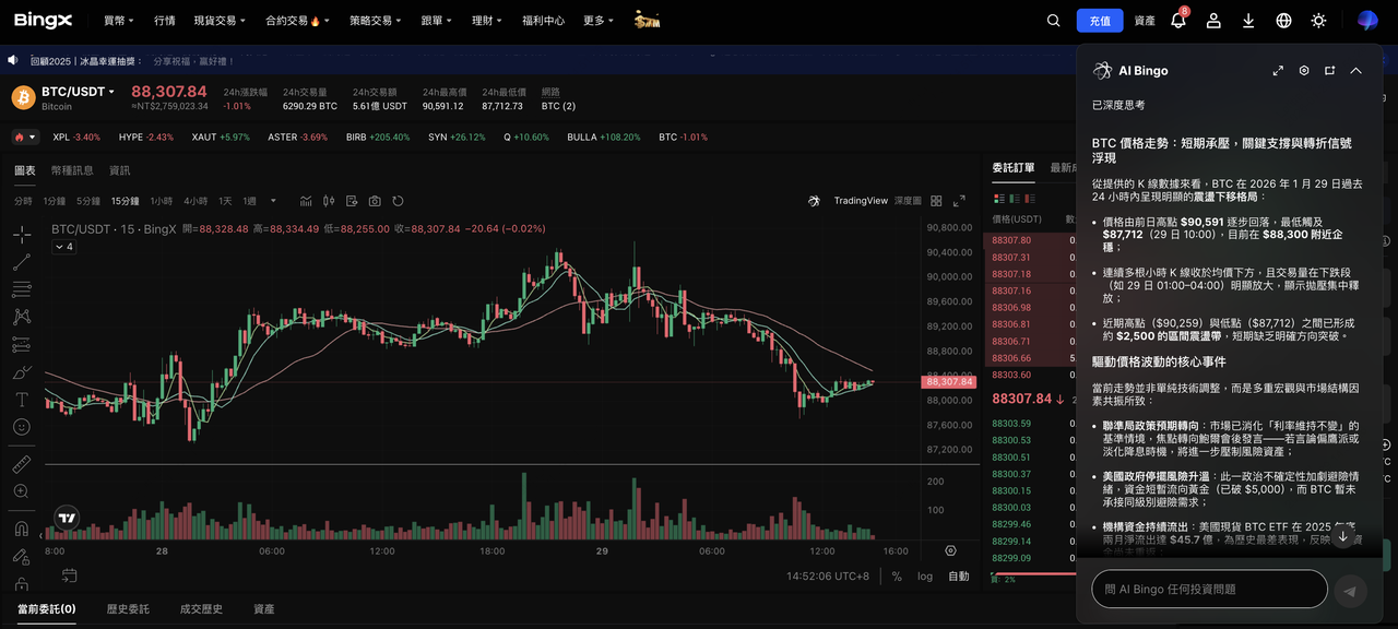 BingX AI 提供的市場數據整理與趨勢觀察功能,輔助判斷當前比特幣的價格節奏與下單時機。