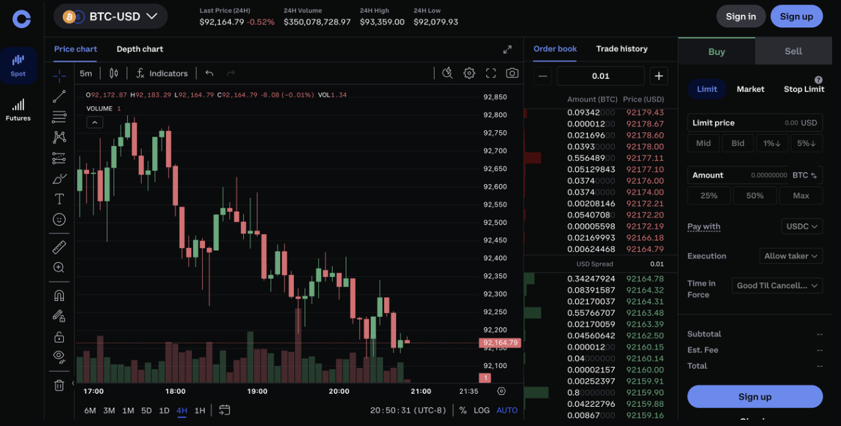 在比特幣(BTC)交易功能方面,Coinbase 提供 BTC 現貨買賣與基礎資產管理工具,介面設計偏向簡潔。平台同時提供一般交易介面與 Coinbase Advanced Trade,後者支援較完整的訂單類型與相對較低的手續費,適合需要更細緻比特幣交易操作的用戶。截至 2026 年,Coinbase 管理的資產規模約 5,160 億美元,約占全球加密貨幣市值的 16%,顯示其在品牌信任與機構採用層面仍具影響力。