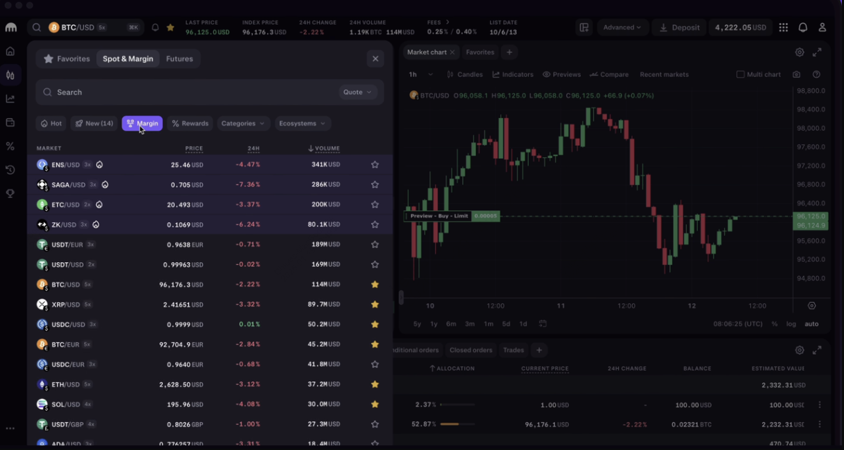 在比特幣交易功能方面,Kraken 提供 BTC 現貨與保證金交易,並支援多種訂單類型與技術分析工具。其專業介面 Kraken Pro 偏向進階使用者設計,較適合已有交易經驗、希望對比特幣進行策略性操作的投資者,而非完全的新手。